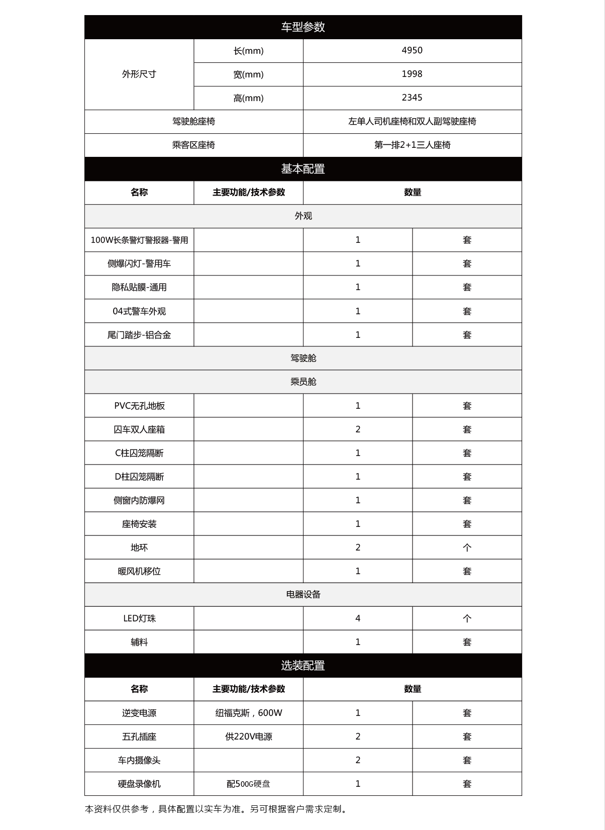 根據(jù)用車需求進(jìn)行改裝,配置更為專業(yè),適用公檢法系統(tǒng)押解任務(wù)