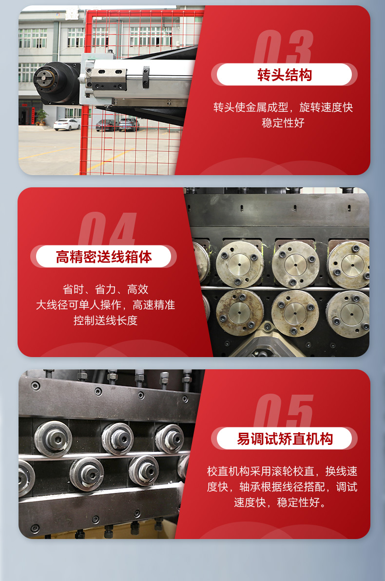 產(chǎn)品特點:適用于生產(chǎn)汽車零部件、汽車門鎖拉桿、工藝品金屬線、廚具餐具支架、倉儲籠、超市貨架、手推車等線材成型產(chǎn)品;轉頭與送線完全分離,真正可實現(xiàn)轉頭時不轉線,確保送線靈活而且穩(wěn)定性高。