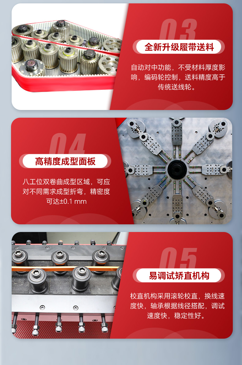 3.履帶送料,具備自動(dòng)對(duì)中功能,不受材料厚度影響,直接使用;同時(shí)安裝編碼輪控制,送料精度高于傳統(tǒng)送線輪。